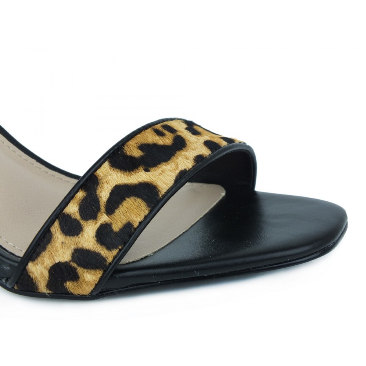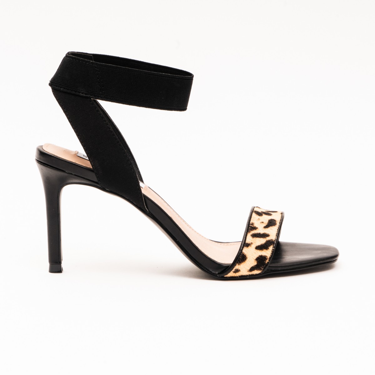 Sandalo Steve Madden mod. FONDU in ecopelle con eco cavallino maculato ed elastico alla caviglia. Sostegno tallone foderato in gros grain nero. Tacco a stiletto cm 9 suola gomma.